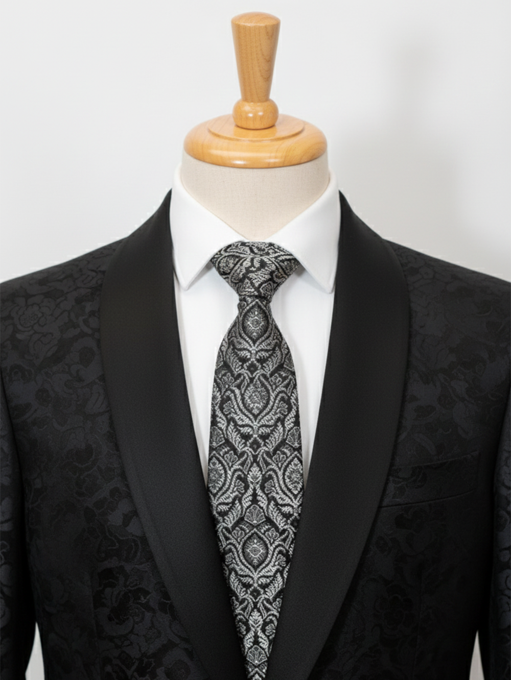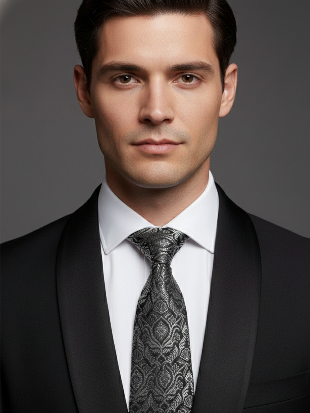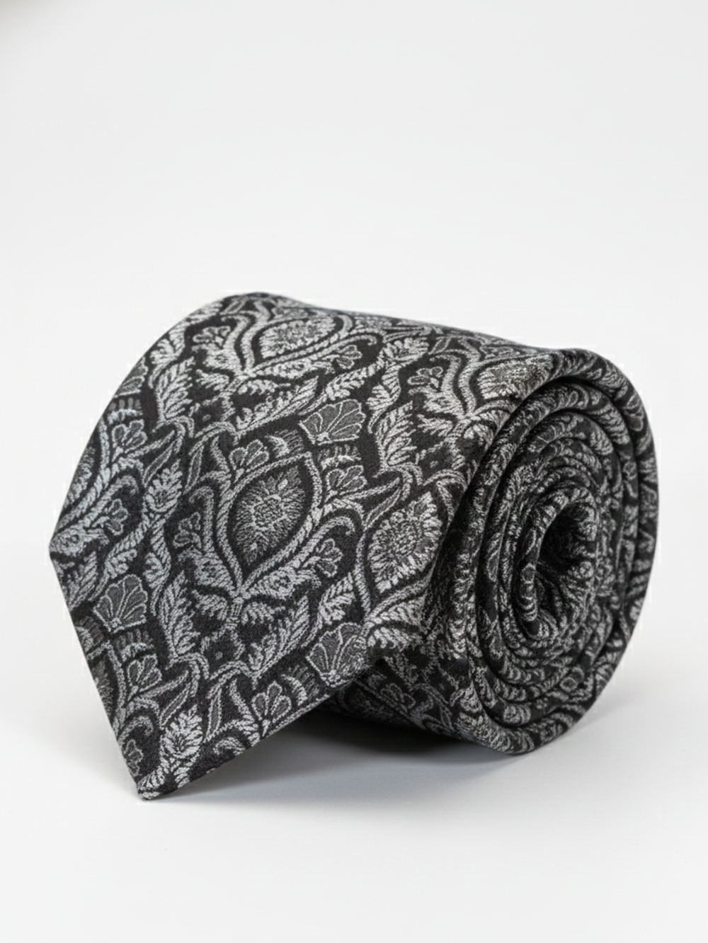 Add to WishlistAdd to CompareElevate your formal wardrobe with this sleek black tie featuring a crisp white print. The striking contrast adds a touch of modern style while keeping the look sophisticated and versatile. Ideal for office wear, formal events, or special occasions, this tie pairs effortlessly with suits in grey, navy, or black, making it a must-have accessory for the stylish man.