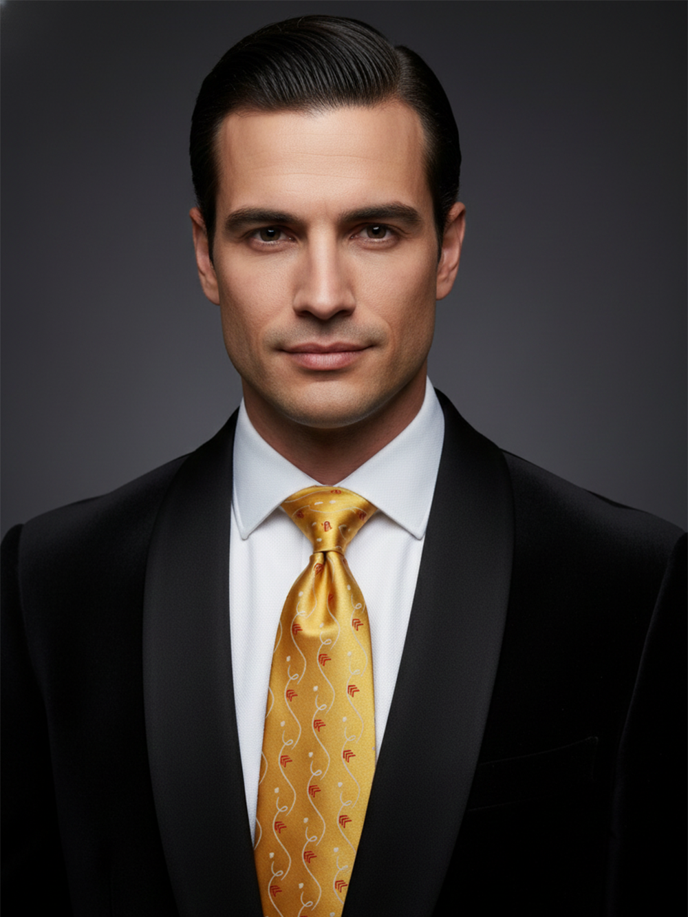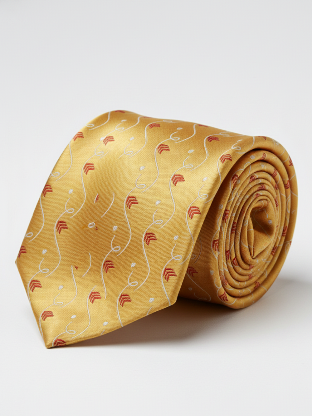 Luxury Golden Silk Tie with Red & White Print ? Designer Formal Necktie