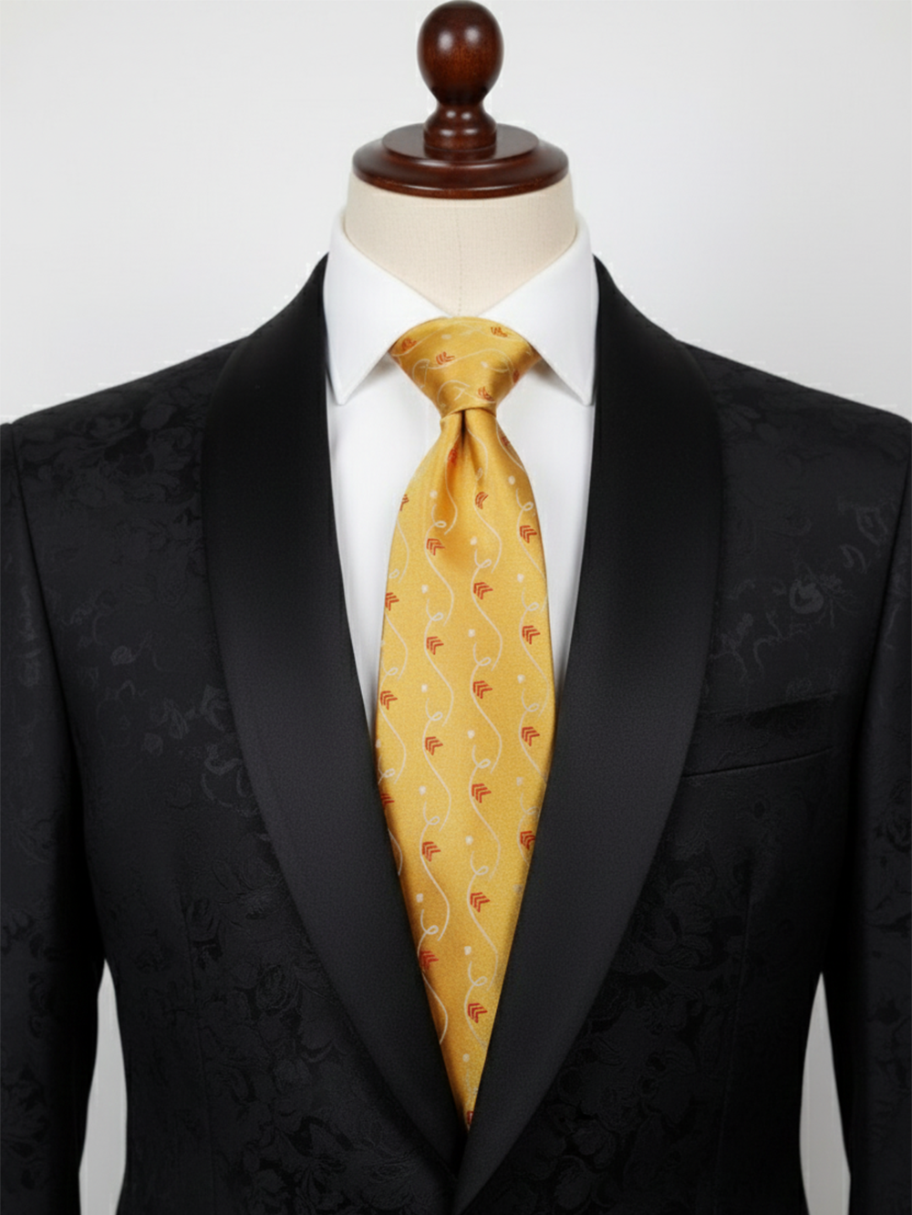 Add to WishlistAdd to CompareMake a refined style statement with this luxury golden silk tie featuring elegant red and white printed accents. Crafted from premium-quality silk, this tie blends a rich golden base with classic contrasting prints, creating a sophisticated yet eye-catching look. Ideal for weddings, festive occasions, formal events, and evening parties, it adds warmth, elegance, and character to any formal outfit.