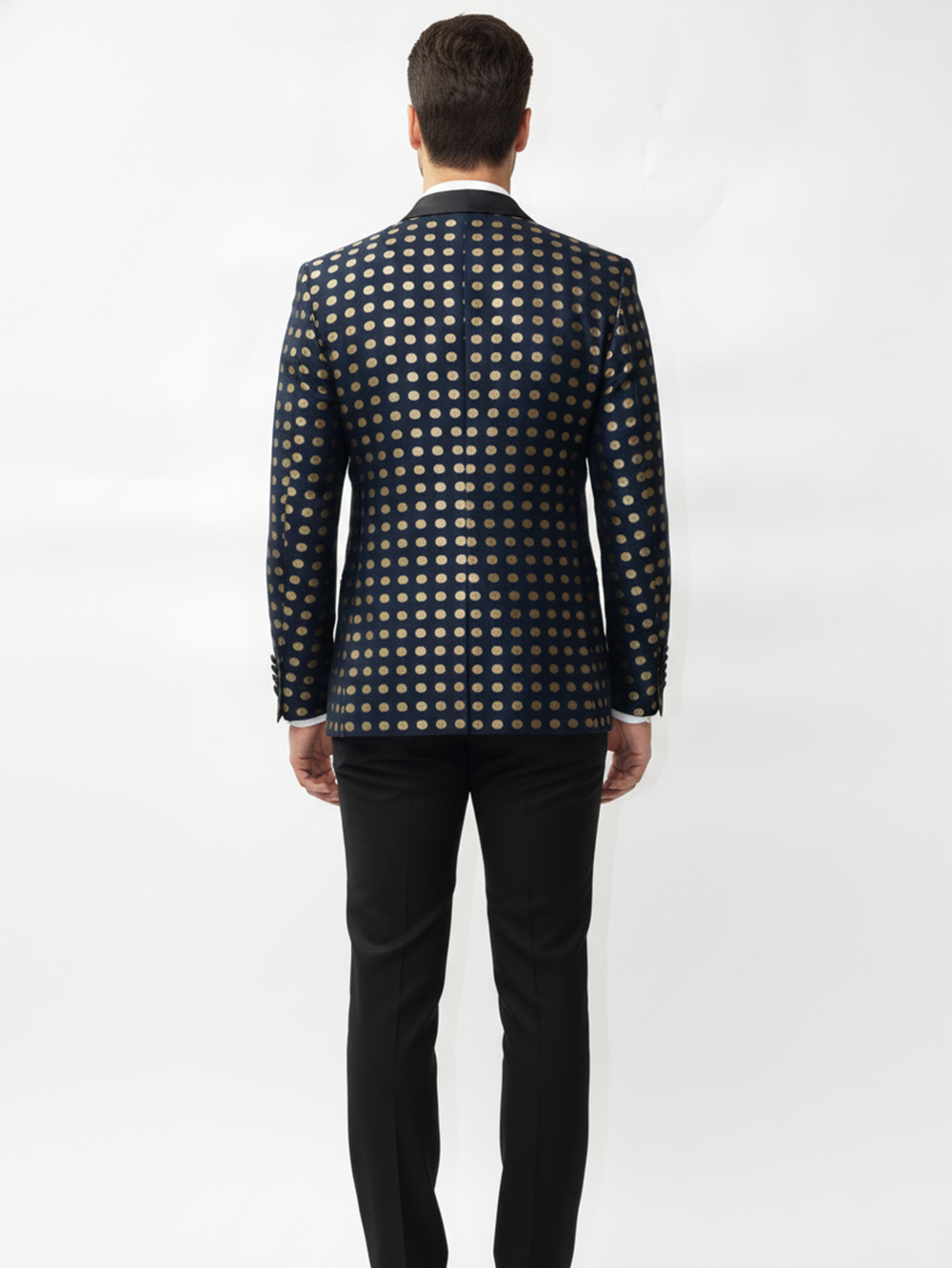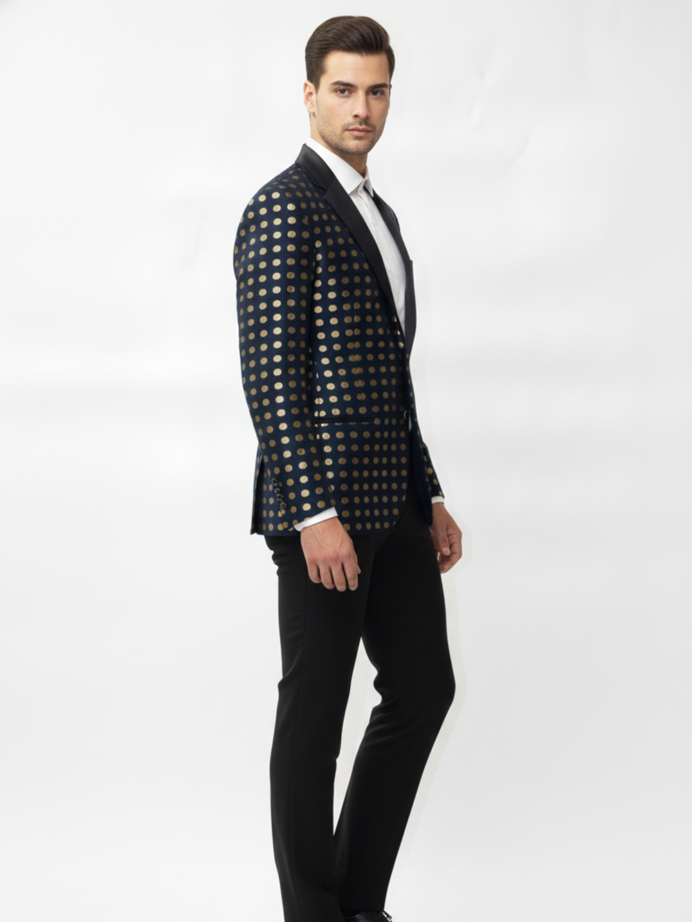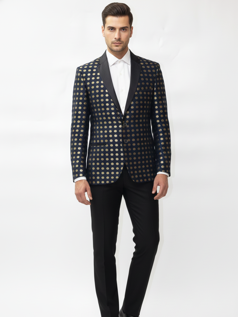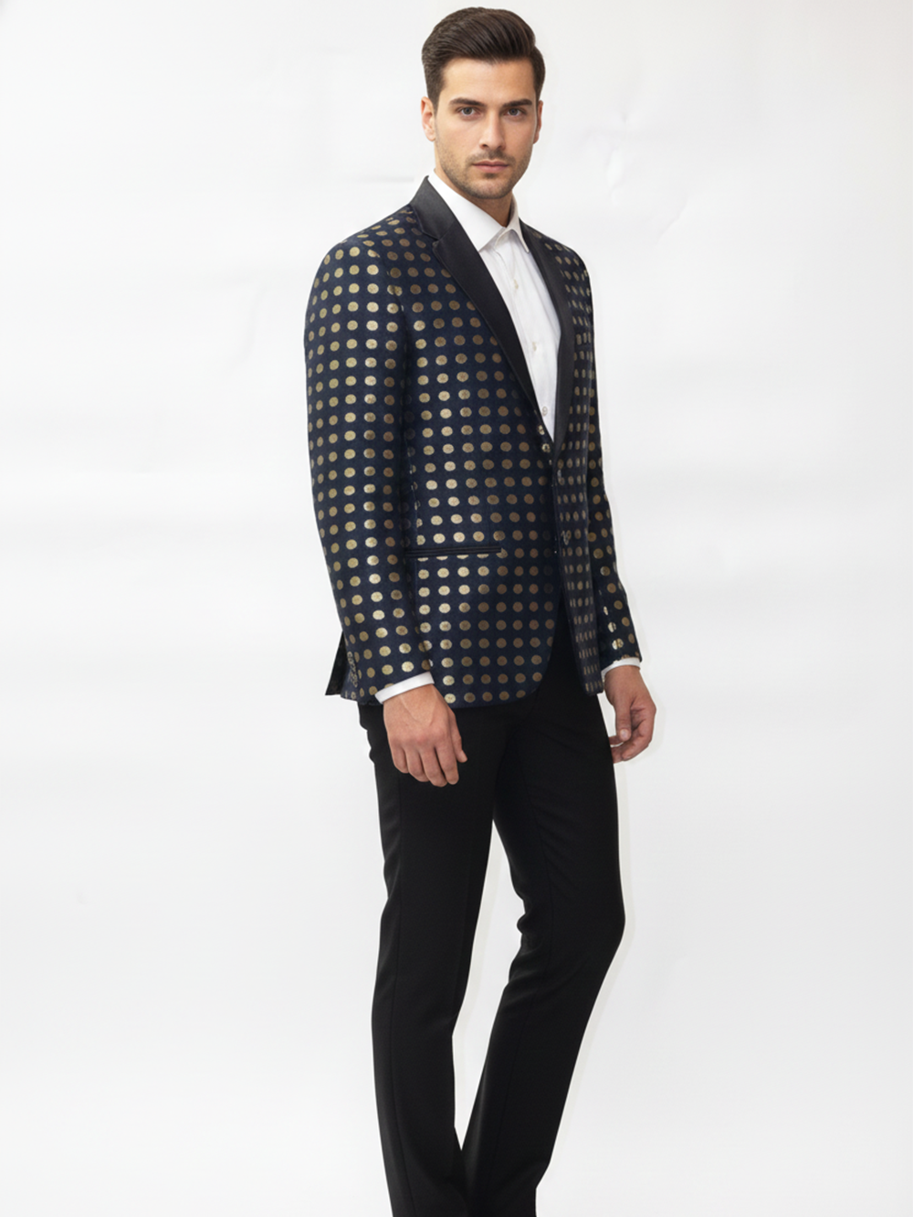 Men?s Luxury Polka Jacquard Tuxedo Blazer ? Black & Gold Evening Jacket